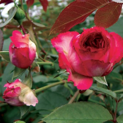Бутоны розы Антик — это самая яркая и декоративная часть растения. Они имеют бокаловидную форму и насыщенный малиново-кремовый окрас, переходящий в нежный кремово-белый цвет самого цветка. Эффектно дополненные карминово-красной каймой, эти двухцветные чашевидные цветки с высоким центром создают незабываемый образ.