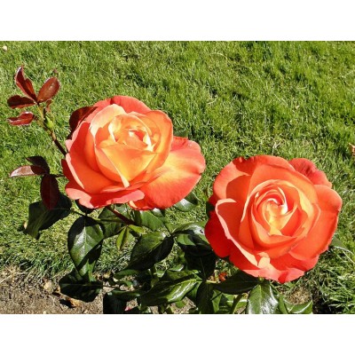 Этот сорт впечатляет своими крупными, около 12 см, махровыми цветами, насчитывающими 30-35 лепестков. Они имеют восхитительный оранжево-персиковый оттенок с легким желтым отливом, что делает их настоящим украшением любого сада.